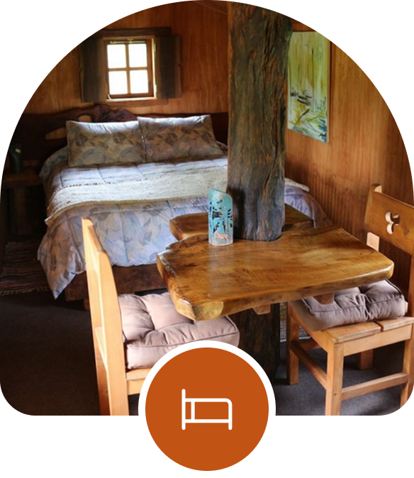 Habitaciones conceptuales insertas en el bosque, sin energía eléctrica, validando la experiencia de encontrarse con la naturaleza. Recibir un desayuno a más de seis metros de altura y dormir con el movimiento de un árbol. Hot Tub que permite contemplar las estrellas rodeado de un bosque de Nothofagus.